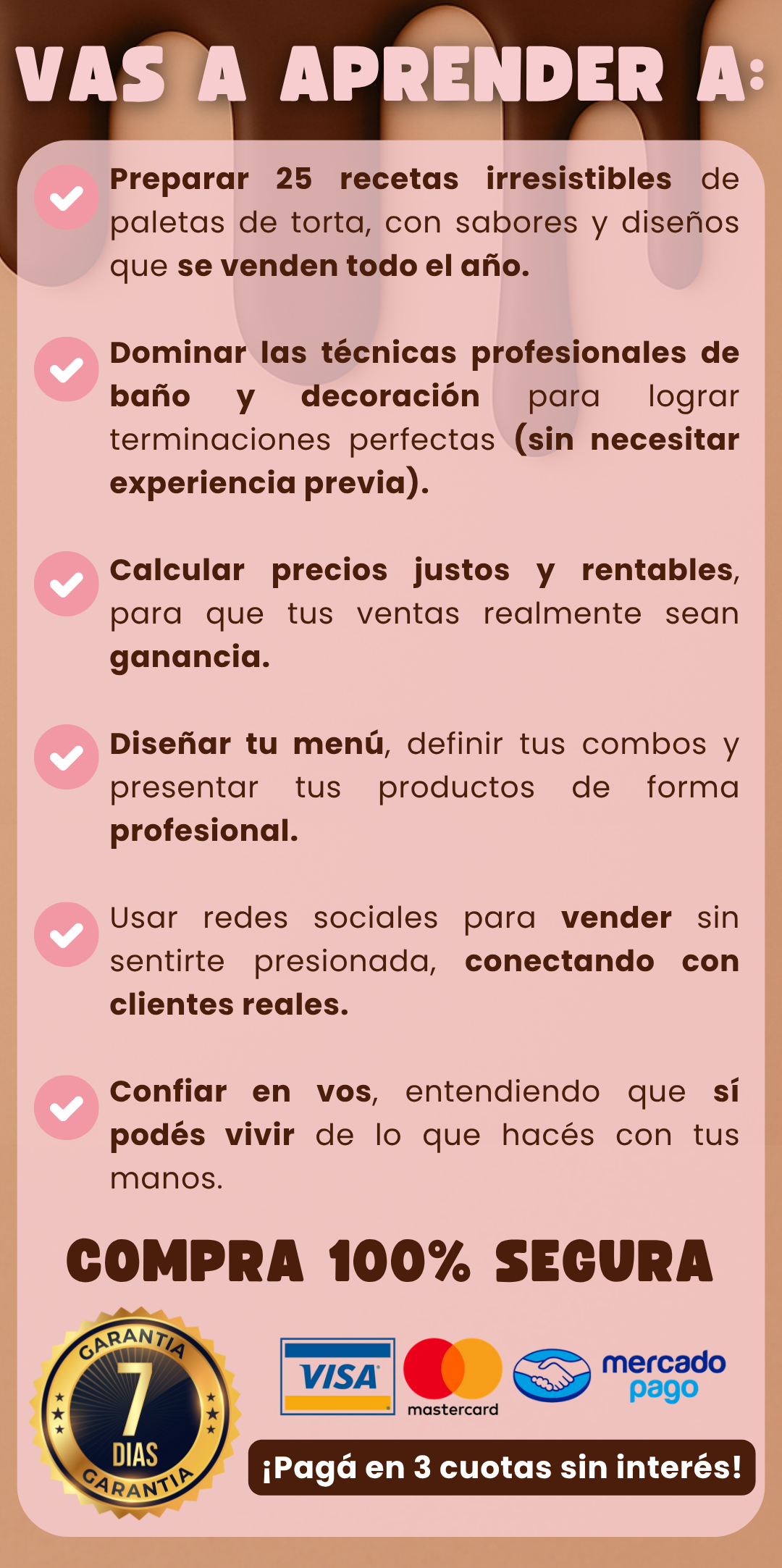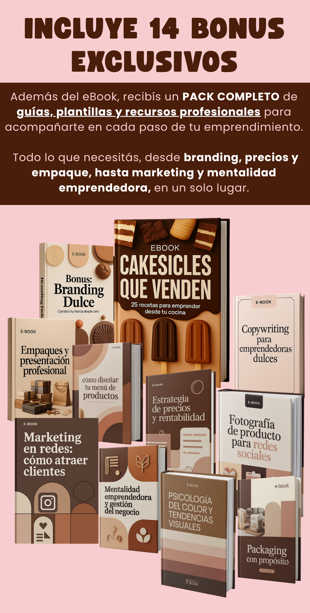 Incluye 25 recetas exclusivas de cakesicles, guías paso a paso, consejos de decoración y presentación, y acceso a 14 bonus con herramientas de marca, precios, fotografía, marketing y más.